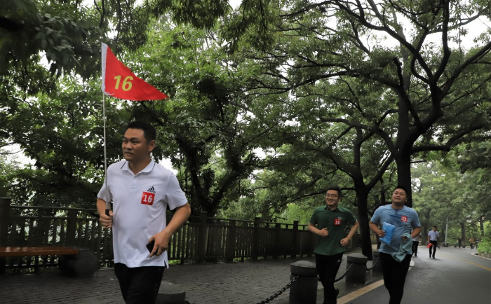 雨中的花果山,雾霭缭绕、峰峦叠嶂,置身其中,心旷神怡。为保障竞赛有序进行,及时为队员补充能量,“厚朴花”志愿者、后勤工作组冒雨作业,在赛段中的九龙桥、三元宫设置两处打卡点,供参赛人员进行补水,并按竞赛规则,协助队员打卡拍照。经过第一个打卡点时,各支队伍已渐渐拉开距离,一批年轻将士血脉偾张,作为“箭头”向着顶峰发起冲锋;一些队伍抱团行进,做到一个也不能少;后续队伍紧追不舍,不甘人后,频频询问前方人数。